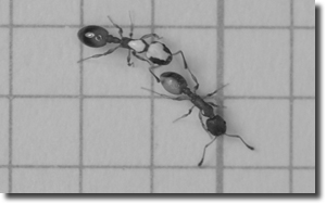 Abb. 1: Schüler mit Lehrer. Die Schmalbrustameise rechts unten führt den Weg zur Futterquelle, die andere hält über ihre Fühler Kontakt und folgt dieser. Zur Beobachtung wurden die Ameisen farbmarkiert und gefilmt. Ein Computer zeichnete die zurückgelegten Wegstrecken beider Tiere auf. (Aus Franks & Richardson 2006, mit freundlicher Genehmigung)