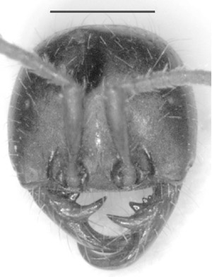 Abb. 2: Ein Porträt der Treiberameise C. andicola mit ihren furchterregenden Mandibeln. Diese Art erbeutet sehr wahrscheinlich auch größere Tiere, nicht nur Insekten wie andere Arten in ihrer Region. Balken: 1 mm (Aus O’Donnell et al. 2005, © Blackwell Publishing, mit freundlicher Genehmigung)