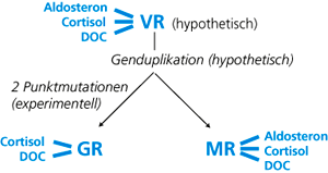 Treten die beiden dazu erforderlichen Mutationen nacheinander auf, so führt dies entweder über eine Zwischenstation, in der der Rezeptor die drei Hormone gar nicht oder nur ganz schwach binden kann oder auf der er DOC und die anderen beiden Hormone nur schwach binden kann (in Abb. 2 rechts oben bzw. links unten). Die jeweils zweite Mutation führte dann zum heutigen GR, das die (in diesem Szenario erneute!) Fähigkeit besitzt, Cortisol (stärker) zu binden (während Aldosteron nach wie vor nicht mehr gebunden wird) (in Abb. 2 die Schritte nach rechts unten). Das andere Duplikat des VR wurde zum heutigen MR, das wie der VR alle drei Hormone binden kann.
