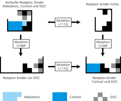 Abb. 2: Dieses Bild zeigt links oben schematisch den hypothetischen Vorläufer-Rezeptor, der Aldosteron, Cortisol und DOC bindet. Die Mutation L111Q führt zum Verlust der Bindungsfähigkeit des Rezeptors (dargestellt durch Verformung der Bindungstasche). Die Mutation S106P führt dazu, dass Aldosteron und Cortisol nur noch sehr schwach gebunden werden können, während DOC unverändert gebunden werden kann. Beide Mutationen zusammen erlauben wieder eine starke Bindung von Cortisol; Aldosteron passt jedoch nach wie vor nicht mehr. (Nach Adami 2006)