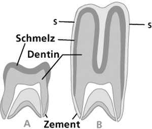 Abb. 1: Niedrigkroniger Zahn (A) und hochkroniger (hypsodonter) Zahn (B) mit säulenförmig verlängerten Höckern, tief eingefaltetem Zahnschmelz und vollständigem Zementüberzug. Im Gegensatz zum niedrigkronigen bleibt beim hochkronigen Backenzahn das Kauvermögen durch Zahnschmelz und Zement voll erhalten, wenn er (etwa bis zur Linie s-s) durch die harte Kieselsäureeinlagerung der Gräser mehr und mehr abgekaut wird. Das gilt erst recht, wenn der Zahn lange Zeit oder sogar zeitlebens nachwächst. (Nach Romer & Parsons 1991).