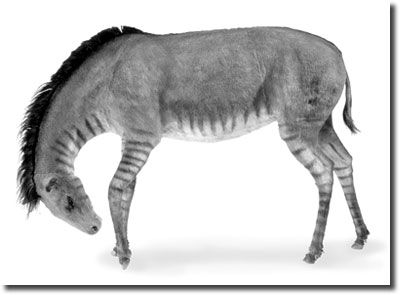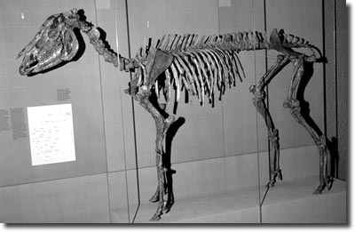 Abb. 2: Modell des unter- bis obermiozänen „Waldpferdes“ Anchitherium. Sein niedrigkroniges Gebiß war nur für Blattnahrung, nicht für harte Gräser geeignet. Schulterhöhe 1,30 m. (Aus Heizmann et al. 1996; Abdruck mit freundlicher Genehmigung).