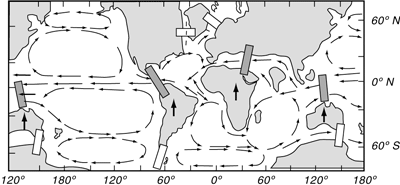 Abb. 4: Vereinfachte Modellvorstellung der Änderung von Meeresströmungen im Mittel/ Jungtertiär als vermutete Teilursache einer komplexen, mehrstufig verlaufenden globalen Abkühlung: Durch die unterschiedlich schnelle Nordwanderung der Südkontinente Australien, Afrika, Indien und Südamerika (mit Pfeilen nach Norden) und ihre Kollision mit Eurasien (und Nordamerika) wurde die tropisch-subtropische Ost-West-Warmwasserzirkulation der Ozeane nach und nach unterbrochen (blaue Balken). Die gleichzeitige Öffnung der Meereswege zwischen der Antarktis und den nordwärts driftenden Südkontinenten (helle Balken) isolierte die Antarktis vom subtropischen Meerwasser. Zunehmend wurde der Kontinent von einem kalten Strömungsring umgeben; seit dem Miozän bildete sich Inlandeis. Über Meeresströmungen erhielten die weitgehend voneinander isolierten Ozeane (Atlantik, Indik, Pazifik) mehr und mehr kühles Oberflächenwasser vom antarktischen Strömungsring. Zudem füllten sich die Tiefen der Ozeanbecken komplett mit absinkendem antarktischem Kaltwasser. (Nach Wefer & Berger 2001).