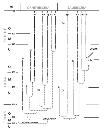 Abb. 5: Fossilüberlieferung der Dinosaurier (Dinosauria). Sie werden in der Evolutionslehre auf Reptilien zurückgeführt, die als Eodinosauria zusammengefaßt sind (unten). Diese hätten sich in die beiden Hauptgruppen, Vogelbecken-Dinosaurier (Ornithischia) und Echsenbecken-Dinosaurier (Saurischia), aufgespalten (oben). Der hypothetische Stammbusch an der Basis ist jedoch nicht fossil belegt (angedeutet durch punktierte Linien). Die gestrichelten Teile der Balken markieren ebenfalls erhebliche Lücken in der Fossilüberlieferung. Sie treten mehrfach in der Abfolge auf, und zwar bei allen weit durchlaufenden Dinosaurierlinien. Links außen: Geologische Systeme, in deren Schichtfolgen die Dinosaurier auftreten (Trias usw.). Großbuchstaben daneben markieren den unteren, mittleren und oberen Abschnitt der Systeme. Daneben die derzeitig angenommenen Alter in Millionen Jahren (Ma; oben). Rechts: Pfeil deutet die vermutete evolutive Abzweigung der Vögel (Aves) an. (Nach Haubold 1990)