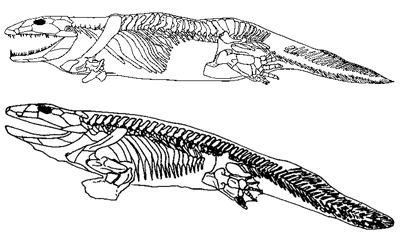 Abb. 1: Die neue Rekonstruktion von Ichthyostega (oben, nach Ahlberg et al. 2005) im Vergleich mit der alten (unten, nach Clack 2002).