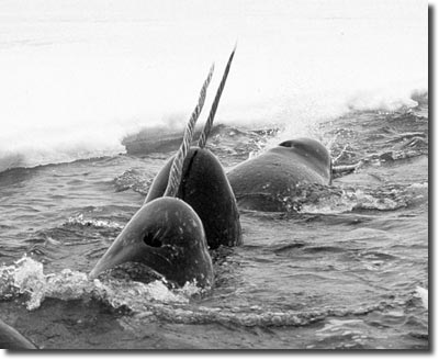 Abb.1: Narwale (Monodon monoceros) mit ihrem typischen, auffällig vergrößerten Vorderzahn. Martin Nweeia und sein Team haben den auffälligen Zahn genauer untersucht und Hinweise gefunden, daß er seinem Träger als Sensor dient. (© Glenn Williams; mit freundlicher Genehmigung von M. Nweeia)