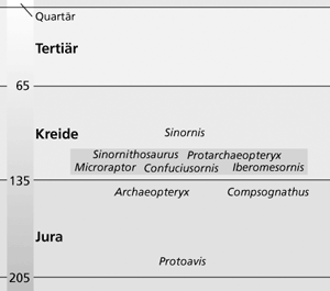 Archaeopteryx ist nach wie vor das älteste unumstrittene Vogelfossil. Erst ab der Unterkreide sind weitere Vogelfossilien bekannt (zur Schichtenfolge siehe Abb. 2). Eine Ausnahme bildet lediglich der sehr umstrittene Protoavis aus der Trias, der von seinem Entdecker S. Chatterjee als deutlich vogelähnlicher als Archaeopteryx eingestuft wird (Chatterjee 1999). Seit Anfang der 1990er Jahre gab es dann eine regelrechte Explosion von Funden fossiler Vögel, die vor allem in China entdeckt wurden. Zwei Drittel aller heute bekannten Vogelfossilien aus der Kreide wurden erst in dieser Zeit entdeckt; mittlerweile sind über 30 Vogelgattungen aus der Kreide bekannt (Chiappe & Dyke 2002, 98). Darüber hinaus wurden mehr und mehr zweibeinig laufende kleinere Dinosaurier (Theropoden*) mit vogeltypischen Merkmalen entdeckt. Dadurch ist die Kluft zwischen Reptilien und Vögeln unter den Fossilien des Jura und der Kreide bei weitem nicht mehr so markant wie noch vor zwei Jahrzehnten.