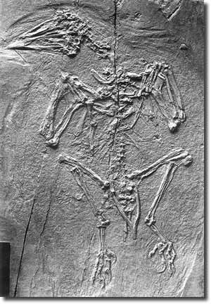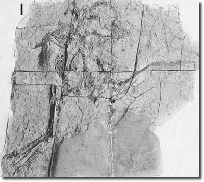 Abb. 8: Eine Platte mit dem Skelett eines Vogels aus der Unterkreide Chinas. Um die Einzelheiten besser hervortreten zu lassen, wurde sie mit Ammoniumchlorid beschichtet. Dabei werden allerdings die Federreste verdeckt. Maßstab: 4 cm. (Aus Peters 1996, Abdruck mit freundlicher Genehmigung des Autors und des Verlags)