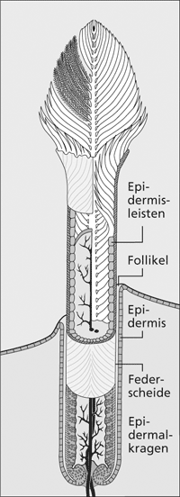 Abb. 6: Schema einer fortgeschrittenen Federanlage, teilweise aufgeschnitten (nach Peters 2001). Der Follikel entsteht durch Einsenkung einer Papille in die Haut. Dabei vermehren sich Zellen in einem Ring um die Federanlage herum. Vom Epidermalkragen werden Zellen nach oben abgegeben, die zu Teilen der Feder werden. Die Feder entwickelt sich zunächst als Zylinder in der anfänglich noch geschlossenen Federscheide. Der Epidermalkragen teilt sich beim Hochwachsen gleich in Säulen, aus denen später die Federäste werden. Die Federentwicklung verläuft fast komplett anders als die Entwicklung von Reptilschuppen.