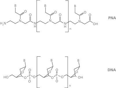 Abb. 1: Allgemeine Darstellung von PNA- und DNA-Strängen, unter Hervorhebung der strukturellen Ähnlichkeit. B = Nucleobase.