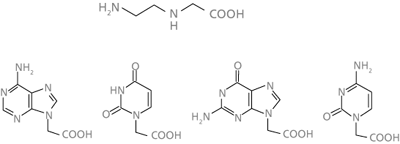 Abb. 2: Die Bausteine für PNA-Stränge: N-(2-aminoethyl) glycin und die N1- bzw. N9-Essigsäure-Derivate der Pyrimidin- bzw. Purinbasen.