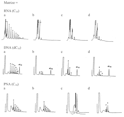 Stereochemische Komplikationen. Da das AEG-Rückgrat achiral ist (d. h. es gibt bei diesem Molekül im Gegensatz zur Ribose keine spiegelbildlichen Strukturvarianten), gab es Hoffnungen, PNA könnte manche Probleme der „RNA-Welt“ lösen. Dies betrifft insbesondere die Bildung optisch reiner Produkte (zur optischen Reinheit siehe Kasten). Experimentelle Untersuchungen unterstützen diese Hoffnungen jedoch nicht. An optisch reinen RNA- (oder DNA-) Matrizen (in deren Rückgrat die Kohlenhydrate Ribose bzw. Desoxyribose also ausschließlich in D- oder L-Form vorliegen) erfolgt keine replikative Synthese eines ebenfalls optisch reinen Tochterstranges, wenn die Ribonukleosid-Bausteine (typischerweise in einer Konzentration von 0,01-0,1 mol/l angeboten) als Mischung spiegelbildlicher Moleküle vorliegen. Es entsteht sogar überhaupt kein Tochterstrang, sondern nur sehr kurze Stücke infolge von Strangabbruch (enantiomere Kreuz-Inhibition). Wie ist es nun mit einer Mischung von D-/L-Ribonukleotiden, wenn die Matrize nun PNA statt RNA oder DNA ist, die also stereochemisch „blind“ ist? In Abb. 3 ist gezeigt, daß an RNA- bzw. DNA Matrizen nur bei Zugabe der passenden Bausteine Tochterstränge gebildet werden; gibt man sowohl D- als auch L- Bausteine zu, unterbleibt dies. Bei PNA bilden sich sowohl bei Zugabe von D- als auch bei Zugabe von L-Bausteinen Tochterstränge; Gemische ergeben jedoch wiederum keine Tochterstränge.