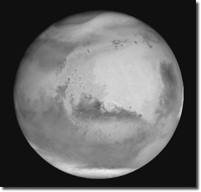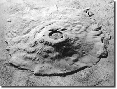 Abb. 3: Der Olympus Mons des Mars, mit 27 km Höhe der höchste Berg des Sonnensystems. Entweicht aus seinen Spalten Methan? (http://astro.vision.free.fr/download/fonds/10/olympus_mons1b.jpg)