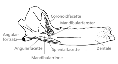Abb. 2: Bruchstück eines Unterkiefers von Teinolophos, von der Innenseite gesehen. Die tiefe Mandibularrinne beherbergt bei besser bekannten Formen ein stabförmiges Aggegrat von Unterkieferknochen. Erkennbar sind auch Facetten (Ansatzflächen) für das