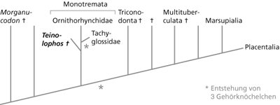 Abb. 3: Phylogenetische Position von Teinolophos. Diese Position erfordert die mindestens zweimalige Entstehung der Säuger-Gehörknöchelchen (Sterne). (Nach Maisch 2005)Spleniale, das Coronoid und das Angulare. (Nach Rich et al. 2005)