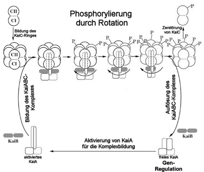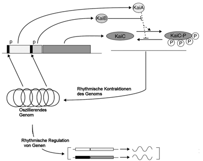 Der Oszillator der cyanobakteriellen Uhr besteht im wesentlichen aus drei Proteinen, deren Gene hintereinander auf dem Chromosom liegen. Sie werden KaiA, KaiB und KaiC genannt (nach japanisch kai = Zyklus). KaiC ist dabei die „Ausgabeeinheit“, die das Zeitsignal weitergibt. KaiC versieht sich dabei selbst rhythmisch mit Phosphatgruppen bzw. spaltet diese wieder ab. Diese Phosphorylierung wird von KaiA befördert, die Abspaltung der Phosphatgruppen gleichzeitig gehemmt. KaiB wiederum hemmt KaiA. Über den Mechanismus der Auf- bzw. Abwicklung des Erbguts, vermittelt durch phosphoryliertes KaiC, werden die Gene kaiB und kaiC ebenfalls rhythmisch abgelesen, während die Menge an KaiA kaum schwankt. Das geschilderte und stark vereinfachte Wechselspiel biochemischer Vorgänge ist so eingestellt, daß es einen vollen Kreislauf einmal am Tag durchläuft, auch wenn die Zellen sich in dieser Zeit mehr als einmal teilen (Abb. 1).