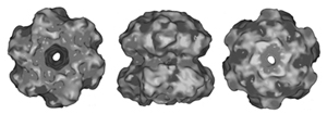 Abb. 2: Die Ringstruktur von KaiC. In das Loch wird KaiA eingeführt, worauf sich KaiC dreht. (Aus Wang 2005)