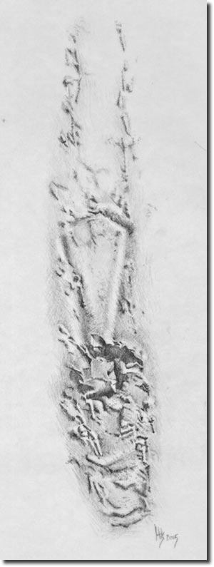 Abb. 1: Langarmkrebs Mecochirus auf einer Platte aus dem Solnhofener Plattenkalk. Die Laufspuren des Krebses sind jedoch hier nicht eingedrückt worden. Vielmehr handelt es sich um Ausgüsse, denn sie sind erhaben. Die Ausgüsse entstanden, als die nächste Kalkschlicklage die Fährten bedeckte. Das wiederum zeigt: Die Platte ist die Unterseite der Kalkschlicklage, die die Krebsspuren und den lebenden Krebs verschüttete. Ferner sind die überlangen Scherenbeine nur als Abdruck vorhanden, während es sich bei dem unregelmäßigen „Knäuel“ um das abgestreifte Häutungshemd handelt (s. Abb. 2). (Zeichnung: Marion Bernhardt; nach einem Foto von Günter Schweigert)