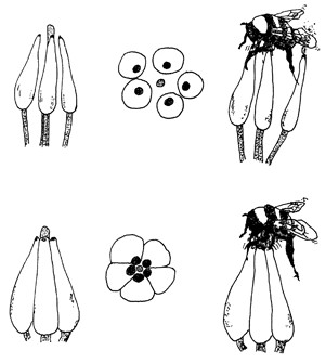 Abb. 2: Bestäubungsvorgang an losen (oben) und an miteinander verbundenen Staubblättern („Pfefferstreuer“, unten). (Nach Glover et al. 2004)