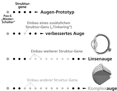 Abb. 1: Stark schematisierte Darstellung des hypothetischen „Gene-Tinkerings“ am Beispiel des Auges. Ein Augen-Prototyp wird zunächst als gegeben vorausgesetzt. Die weitere hypothetische evolutive Entwicklung erfolgt durch sukzessive Einfügung weiterer Gene, die unter der Kontrolle des Master-Gens (Hox-Gen, hier Pax-6) stehen. Die verschiedenen Augentypen sollen demnach durch unterschiedlichen Einbau untergeordneter Gene entstanden sein. Das Hox-Gen bleibt dasselbe und kann daher die Entwicklung verschiedener Augentypen induzieren.