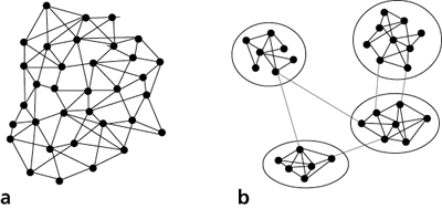 Abb. 2: Nicht-modulare (a) und modulare Netzwerke (b).