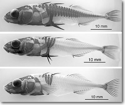 Abb. 1: Viel, wenig, weg. Stichlinge verlieren im Süßwasser ihre knöchernen Panzerplatten (Mitte), sowie die Beckenstacheln (unten). (Foto: W. Cresko, University of Oregon, Abdruck mit freundlicher Genehmigung)