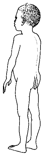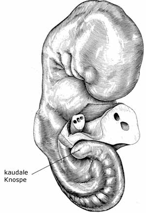 Abb. 3 (links): „True Tails“ Variante C: Embryo im Alter von 4 1/2 Wochen, die kaudale Knospe bildet das untere Körperende. (Nach Blechschmidt)
