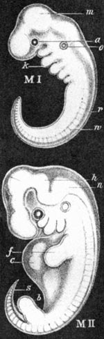 Darwin selbst ging bekanntlich von einer engen Wechselbeziehung zwischen der Individualentwicklung der Organismen und ihrer Stammesgeschichte aus. Seine Vorstellungen basierten auf Angaben von v.Baer, die Darwin in eine phylogenetische Lesart übertrug: „Die Abstammung ist aus meiner Sicht das geheime verbindende Band, das die Naturalisten im Begriff des natürlichen Systems gesucht haben. Aus diesem Blickwinkel können wir verstehen, daß für die meisten Naturalisten bei der Klassifikation die Struktur des Embryos wichtiger ist als die des ausgewachsenen Individuums. Denn der Embryo repräsentiert das Lebewesen in seinem am geringsten modifizierten Stadium und offenbart insofern das Bild seines Vorfahren“ (Darwin 1859, S. 449, zit. nach Richards 1992). Ins Extrem gesteigert finden wir diesen Zusammenhang bei Ernst Haeckel. Seine Embryonenbilder zeigen menschliche Embryonen mit deutlich – aber künstlich! – verlängertem kaudalem Pol, den er Schwanz nannte (Anthropogenie 1874, Abb. 4).
