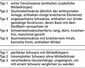 Eine einheitliche Klassifikation und Darstellung der angesprochenen Phänomene erwies sich wegen der verwirrenden Vielfalt bekannter Merkmalskombinationen als unmöglich. Für unsere Betrachtung relevant sind die als „true tails“ („wahre, echte Schwänze“) deklarierten Strukturen. Welche Fehlbildungen diesen Namen verdienen oder nicht, wird von den Autoren kontrovers diskutiert. In der Literatur wurden in den letzten 120 Jahren damit zumeist drei unterschiedliche Befundkomplexe beschrieben, zwei davon entsprechen echten embryonal-fetalen Fehlbildungen, die dritte einem normalen embryonalen Merkmalsgefüge. Davon abgegrenzt sind unter der Bezeichnung „Pseudotails“* meist äußerlich ähnliche Mißbildungen, die klinisch in Kombination mit bösartigen Tumorbildungen oder schweren Entwicklungsstörungen der Wirbelsäule und/oder des Zentralen Nervensystems auftreten. „Pseudotails“ besitzen für phylogenetische Betrachtungen keine wesentliche Bedeutung und werden an dieser Stelle nicht weiter berücksichtigt. Eine scharfe Abgrenzung der „Pseudotails“ gegen einzelne zu den „true tails“ gerechnete Strukturen ist jedoch nicht immer sicher möglich (Dubrow 1988, Dao 1983).