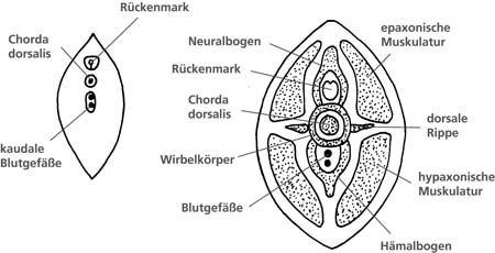 Der Schwanz ist ein charakteristisches Merkmal nahezu aller Organismen, die zu den Wirbeltieren (Vertebraten) zählen. Damit unterscheiden sie sich u.a. von den übrigen Unterstämmen der Chordata (Tiere mit Anlage einer Chorda dorsalis), zu denen z.B. die Tunicaten (Manteltiere) und das Lanzettfischchen (Amphioxus) zählen. Bei ausgewachsenen Wirbeltieren läßt sich ein allgemeiner Bauplan des Schwanzes wie folgt beschreiben (nach Romer & Parsons [1991], vgl. dazu Abb. 6). Im Querschnitt zeigt dieser typischerweise ein aufrecht stehendes Oval, zentral gelegen ist die Wirbelsäule – speziell die Elemente des Steißbeins (Os coccygis) –, darüber angeordnet ist das Neuralrohr, in dem Nerven, Anteile des Rückenmarks oder nur die Rückenmarksflüssigkeit zu finden sind. Jegliche Andeutung einer Art Leibeshöhle mit den von ihr umschlossenen Eingeweiden fehlt. Weiterhin zur Grundstruktur gehören segmental angeordnete Muskelgruppen und unterhalb der Wirbelkörper verlaufende Blutgefäße. Bei den Wirbeltieren besteht eine große Variabilität bezüglich der Anzahl der Wirbelkörper (30-200), bei den meisten Säugetierordnungen hingegen ist bis auf die Schwanzregion (0-50 coccygeale Wirbelkörper) die Anzahl der übrigen Wirbelkörper im Bereich der Hals-, Brust-, Lendenwirbelsäule und des Kreuzbeins relativ konstant.