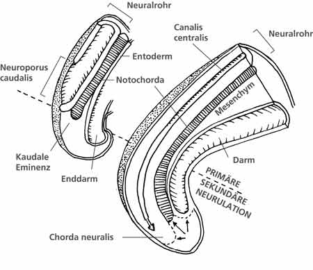 In der 4. Entwicklungswoche wird bei dem ca. 2,5-4,5 mm großen menschlichen Embryo die Schwanzknospe sichtbar. Ein stabartiger Auswuchs (Chorda neuralis) des im embryonalen Rumpf bereits angelegten Neuralrohres beginnt ab Höhe des Neuroporus caudalis in Richtung der zunächst allein aus mesodermalen Zellen bestehenden kaudalen Knospe auszuwachsen. Dabei überwächst diese Chorda neuralis das untere Ende der Chorda dorsalis (ein knorpliger Stab, der u.a. die Wirbelkörperbildung oberhalb des Kreuzbeins induziert) sowie das Ende des Enddarms (Anus). Die kaudale Knospe stellt ab der 4. bis zur der 8. Entwicklungswoche (der Embryo ist jetzt 27-31 mm groß) das untere Ende des embryonalen Körpers dar. Das Neuralrohr, aus dem später u.a. das Gehirn, das Rückenmark und die Nerven hervorgehen, bildet sich im Rumpf und im Kopf über den Weg der primären Neurulation. Dabei falten sich die Blätter des embryonalen Nervengewebes zu einem Rohr zusammen. Anders als in den übrigen kopfwärts gelegenen Abschnitten entstehen innerhalb der Chorda neuralis der Schwanzknospe durch innere Aushöhlung (= sekundäre Neurulation*) die unteren Anteile des Neuralrohres. Dieses gewinnt nach oben (proximal) Anschluß an den durch die primäre Neurulation gebildeten oberen Anteil des Neuralrohres. In dieser Phase wird der untere Anteil der Chorda neuralis zum Ende des gesamten Neuralrohrs und macht den Hauptbestandteil der Schwanzknospe aus.
