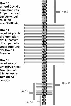 In den letzten Jahren wurde die Bedeutung der Hox-Gen-Cluster* für die Differenzierung der kaudalen Knospe und der daraus hervorgehenden Strukturen weiter erhellt. Analog der Situation bei der Gliedmaßenentwicklung zeigen die Zellen der kaudalen Eminenz anfangs einen homogenen histologischen* Aufbau, jedoch entsprechend ihrer Position in Bezug auf die Raumachsen ein genetisch differenziertes Expressionsmuster. Den Hox-Gen-Clustern 9-13 kommt eine führende Rolle bei der Steuerung der typischen Herausbildung der spezifischen Wirbelkörper entlang der Körperachse (z.B. Brustwirbelkörper mit Rippen, Lendenwirbelkörper ohne Rippen, Sakralwirbel mit verschmolzenen Querfortsätzen, Steißbeinwirbel verschmolzen ohne Rippenansatz) zu. Dabei konnte gezeigt werden, daß das jeweils distal aktiv werdende Hox-Gen-Cluster die Funktion der unmittelbar proximal gelegenen Gruppe hemmt. So verhindert z.B. Hox-10 bei Mäusen die Ausbildung von Rippen im Bereich der Lendenwirbelsäule bis zum Steißbein, Hox-11 dagegen hemmt die Wirkung von Hox -10 im Bereich der Sakralwirbel, weshalb dort die verschmolzenen Querfortsätze das typische Bild des Kreuzbeins bilden (Wellik & Capecchi 2003). Interessant ist die auch die Tatsache, daß bei Mäusen Mutationen mit einem Funktionsverlust des Hox-Gen-Clusters 13 (sog. „loss-off-function Mutation“) zu einer deutlichen Vergrößerung und numerischen Zunahme der Schwanzwirbelkörper führen, deren Verschmelzung jedoch weitestgehend ausbleibt (Economides et al. 2003, vgl. Abb. 8 und 9).