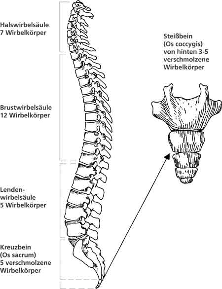 Abb. 9: Schematische Anatomie der Wirbelsäule und des Steißbeins. (Nach Fenis 1988)