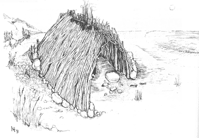 Abb. 2: Altsteinzeitliche Hütte in Terra Amata mit Herdsteinen (auf ca. 300.000 rJ geschätzt). Es wurden Faustkeile des frühen Acheuléen und eine Feuerstelle gefunden. (Zeichnung: Marion Bernhardt)
