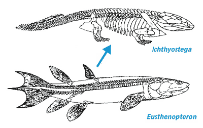 Der Schritt vom Wasser ans Land gehört wohl zu den bekanntesten Beispielen für mutmaßliche evolutionäre Übergänge. Evolutionär gesehen muß dieser Schritt vielfach erfolgt sein, bei Pflanzen, bei wirbellosen Tieren wie z. B. den Gliederfüßern und bei den Wirbeltieren (Tiere mit Innenskelett und einer Wirbelsäule). Bei den Wirbeltieren ist der Schritt an Land vereinfacht als Übergang vom Fisch zum Amphib bekannt. Jedem, der sich ein wenig in Evolutionsbiologie auskennt, dürfte das „Paar“ Eusthenopteron („Noch-Fisch“) – Ichthyostega („Bereits-Amphib“, „Uramphib“) als Standard-Lehrbuchbeispiel begegnet sein (vgl. Abb. 1).