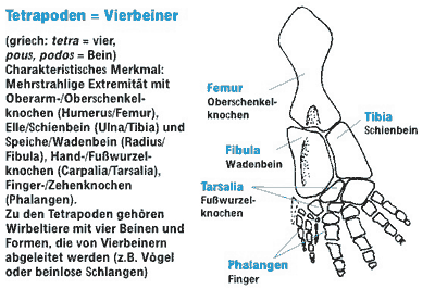Tetrapoden. Die landlebenden Wirbeltiere werden als Tetrapoden (= Vierbeiner) bezeichnet. Die vier Extremitäten (Gliedmaßen) weisen einen charakteristischen Skelettbau auf: Mit dem Schultergürtel ist der Oberarm- bzw. Oberschenkelknochen (Humerus bzw. Femur) gelenkig verbunden, dann folgen ein Knochenpaar (Ulna und Radius bzw. Tibia und Fibula) sowie Hand- bzw. Fußwurzelknochen und Finger- bzw. Zehenknochen (Phalangen) (Abb. 2).1