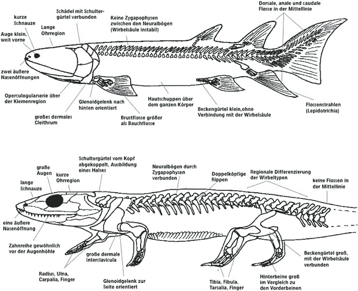 Abb. 3: Skelett eines Fisches ähnlich Eusthenopteron im Vergleich mit einem Tetrapoden wie Dendrerpeton. Die größeren Unterschiede sind beschriftet. (Nach Clack 2002a)