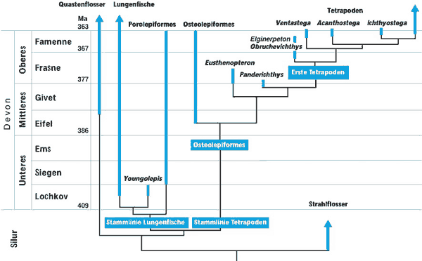 Stratigraphischer Überblick. Der Übergang von Fischen zu Vierbeinern soll im Oberdevon begonnen haben und im Unterkarbon vollendet worden sein. Abb. 4 gibt einen stratigraphischen Überblick über die für diesen Übergang maßgeblichen Fossilformen des Mittel- und Oberdevons. Neben den gut erhaltenen Gattungen Eusthenopteron, Panderichthys, Ichthyostega und Acanthostega wurde eine Reihe von Fossilien gefunden, die nur sehr bruchstückhaft überliefert sind. Ihre Zuordnung zu den Tetrapoden erfolgt anhand indirekter anatomischer Hinweise (Kiefermerkmale oder Merkmale des Schultergürtels oder des Humerus) und ist daher mit Unsicherheiten behaftet; der Bau der Extremitäten ist bei diesen Formen unbekannt. Einige Gattungen wurden erst in den letzten 20 Jahren entdeckt.