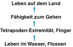 Umbauten. Bei einem Übergang von Fischen zu Vierbeinern müssen tiefgreifende Veränderungen erfolgt sein (Abb. 3; vgl. CLACK 2002a, 35; CARROLL 1993, 174ff.): Betroffen sind u. a. das Tragen des Körpers (die Kräfteverhältnisse sind auf dem Land ganz anders als im Wasser; mit Folgen für die Wirbelsäule und die Extremitäten), die Fortbewegungsweise (Extremitäten mit neuer Funktion: die Fortbewegung steht statt der Steuerung im Vordergrund), die Ausbildung eines Halses zur besseren Beweglichkeit des Kopfes (mit Folgen für Schultergürtel, Verbindung Kopf-Wirbelsäule, Muskulatur), der Bau des Schädels (der Kopf muß stabil sein; im Wasser sind dagegen gelenkige Verbindungen von Schädelteilen wichtig für Kiemenatmung), Nahrungsaufnahme, Atmung, Wasserhaushalt, Sinnesorgane (z. B. Schallübertragung; Augen: anderer Brechungsindex) und Fortpflanzung. Evolutionstheoretisch kann ein solcher Vorgang nur schrittweise erfolgen. Dabei muß bedacht werden, daß die einzelnen Organsysteme und Fähigkeiten mehr oder weniger stark miteinander zusammenhängen (vgl. CLACK 2002a, 190).