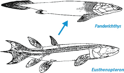 Abb. 7: Von Eusthenopteron zu Panderichthys aus dem unteren Oberdevon ist ein deutlicher Sprung zu verzeichnen. (Nach Clack 2002a)