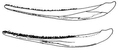 Abb. 9: Langgestreckter Unterkiefer von Elginerpeton (oben von außen, unten von innen. (Nach Clack 2002a)
