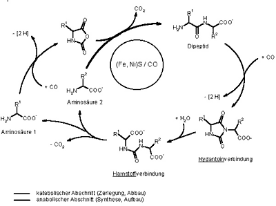In einer jüngst erschienenen Publikation haben HUBER et al. (2003) weitere experimentelle Daten veröffentlicht. Sie konnten Zwischenprodukte der Reaktion von Aminosäuren in Gegenwart von (Ni, Fe)S, CO und Magnesiumhydroxid (Mg(OH)2; zur Stabilisierung des pH-Werts) analytisch identifizieren. Zunächst bestätigt diese Arbeit bisherige Befunde hinsichtlich Abhängigkeit von Temperatur und pH-Wert sowie der Razemisierung. Unter Nutzung spektroskopischer Methoden wurden Hydantoin- und Harnstoffverbindungen nachgewiesen (s. Abb. 1). Aufgrund von kinetischen Untersuchungen postulieren die Autoren eine in Abb. 1 dargestellte Reaktionsabfolge. Im skizzierten Peptidzyklus ist sowohl ein anabolischer (aufbauender) als auch ein katabolischer (abbauender) Abschnitt erkennbar. Die Autoren sehen darin eine frühe Stufe eines Peptidstoffwechsels, der auch sicherstellen soll, daß Peptide mit biologisch unbrauchbaren Komponenten oder ungünstiger Aminosäuresequenz durch Abbau wieder für weitere Reaktionen zugänglich werden. Damit soll nach Ansicht von HUBER et al. Aufbau und Etablierung von Peptidbibliotheken gewährleistet sein.