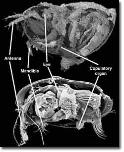 Abb.1: Die Weichteilerhaltung eines fossilen Ostracoden (oben) zeigt detaillierte Ähnlichkeiten mit heute lebenden Formen (unten). (© David Siveter, Abdruck mit freundlicher Genehmigung)