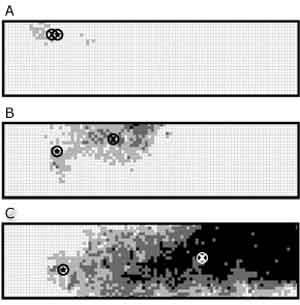 Abb.1: Ergebnisse von drei Computersimulationen zur Fixierung von Mutationen in wandernden Populationen. Die Fixierung von Mutationen geschieht durch Drift und ist damit ein zufallsabhängiger Prozeß. Von links nach rechts ist die Ausbreitungsrichtung der simulierten Population wiedergegeben; die Quadrate repräsentieren Subpopulationen. Ein Stern zeigt die Entstehung einer Mutation in einer Subpopulation an; ein Kreuz zeigt den Schwerpunkt der Mutation in der Gesamtpopulation am Ende der Simulation. Die Schattierungen stehen für die Frequenz der Mutante in den einzelnen Subpopulationen (weiß = 0-25%, hellgrau 25-50%, dunkelgrau 50-75%, schwarz = 75-100%). In A wurde die Mutante nicht durch Drift fixiert, in B kam es nur zur Fixierung in wenigen Subpopulationen; die Mutante im Simulationsexperiment C dominiert die Ausbreitungswelle. Zur statistischen Beurteilung müssen tausende von Einzelsimulationen durchgeführt werden. (Aus Edmonds et al. 2004, Abdruck mit freundlicher Genehmigung)