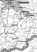Dammbruch im Prießnitz-Seitental. Am 12. 8. um 16.30 Uhr brach in einem Seitental der Damm des Prießnitz-Staubeckens mit rund 50.000 Kubikmetern Inhalt. Die Wassermassen stürzten das abschüssige Prießnitztal herab und verwüsteten den Ort Glashütte (s. Karte). Hier traf der Inhalt des Staubeckens mit den Wassermassen der Müglitz zusammen: „Der normalerweise vier Meter breite und 50 Zentimeter tiefe Fluß ist zu einem teilweise 100 Meter breiten und vier Meter tiefen Strom geworden“, der mit einer vermuteten Geschwindigkeit von 50 km/Std. auf den Ortsteil Schlottwitz zuraste (MILITZER 2002b, 320; vgl. 2002a, 94). Das stundenlange Extremhochwasser der Müglitz wurde jedoch nicht durch den Dammbruch, sondern durch die Starkniederschläge bewirkt, denn auch andere Erzgebirgsflüsse erreichten vergleichbare Pegelhöhen mit ebenso zerstörerischen Fluten (MILITZER 2002b, 319-324).