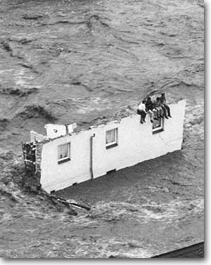 Abb. 1: Das Foto, das um die Welt ging: Die letzte Mauer des Hauses blieb stehen; verzweifelte Anwohner, die nicht helfen konnten, sprachen von einem Wunder. 13 Stunden mußte Familie Jäpel aus Weesenstein hier ausharren, ehe sie vom Hubschrauber gerettet wurde. Vorn das „eigentliche“ Flußbett der Müglitz (!). Die „schmutzige Brühe“ des reißenden Stromes ist – geologisch gesprochen – eine sand- und sogar geröllführende Suspension (Aufschwemmung). Die Gewalt des Hochwassers kann wohl kaum erschreckender dokumentiert werden.