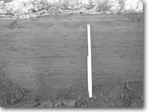 Abb. 7: Horizontal geschichteter Sand unterschiedlicher Korngröße. Schlechte Sortierung, bedingt durch rasche Ablagerung bei reichlicher Sedimentanlieferung.