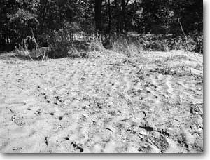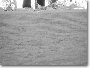 Abb. 2: Oberfläche der Sandbank im Müglitztal. Im Hintergrund (hinter den Büschen) das Flußbett der Müglitz. Die Strömungsrippel zeigen unregelmäßigen Kammverlauf (Strömung von rechts), sind aber beim Rückgang des Hochwassers im schwach fließenden bis stehenden Wasser wellenrippelartig überprägt worden.