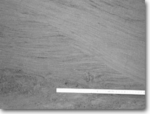 Abb. 3: Feine Horizontalschichtung (Lamination); nach oben Übergang in Strömungsrippelschichtung. Ganz oben erneute Horizontalschichtung (Strömung von links).