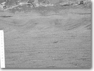 Abb. 5: Übergang nach oben in kletternde Rippeln (climbing ripples; Strömung v links). Bei kletternden Rippeln lagert sich Sediment sowohl der Vorderseite (luv) als auch an der Rückseite (lee) ab. Hier wird in extremer Weise luvseitig abgelagert; die Rippeln wachsen gegen die Strömung schräg nach oben.